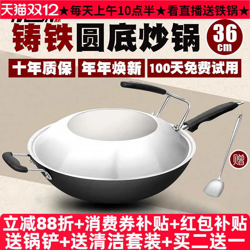 豪森铸铁锅圆底炒锅 燃气灶适用36cm手J工生铁大铁锅炒菜锅不粘锅