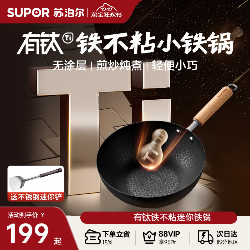 苏泊尔有钛无涂层小炒锅一人食家用铁不粘小铁锅平底炒菜锅不粘锅