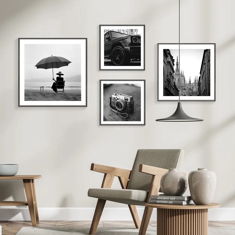 黑白装饰画客厅餐厅玄关壁画建筑摄影照片背景挂画组合现代轻奢画