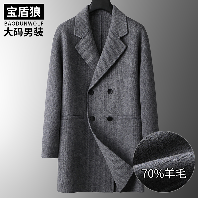 加大码中长款男士双排扣羊毛呢大衣特大号纯色宽松双面呢胖子外套