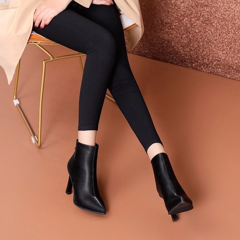 细跟尖头短靴女黑色高跟鞋秋冬工装鞋猫跟工作鞋低跟裸靴真皮女靴