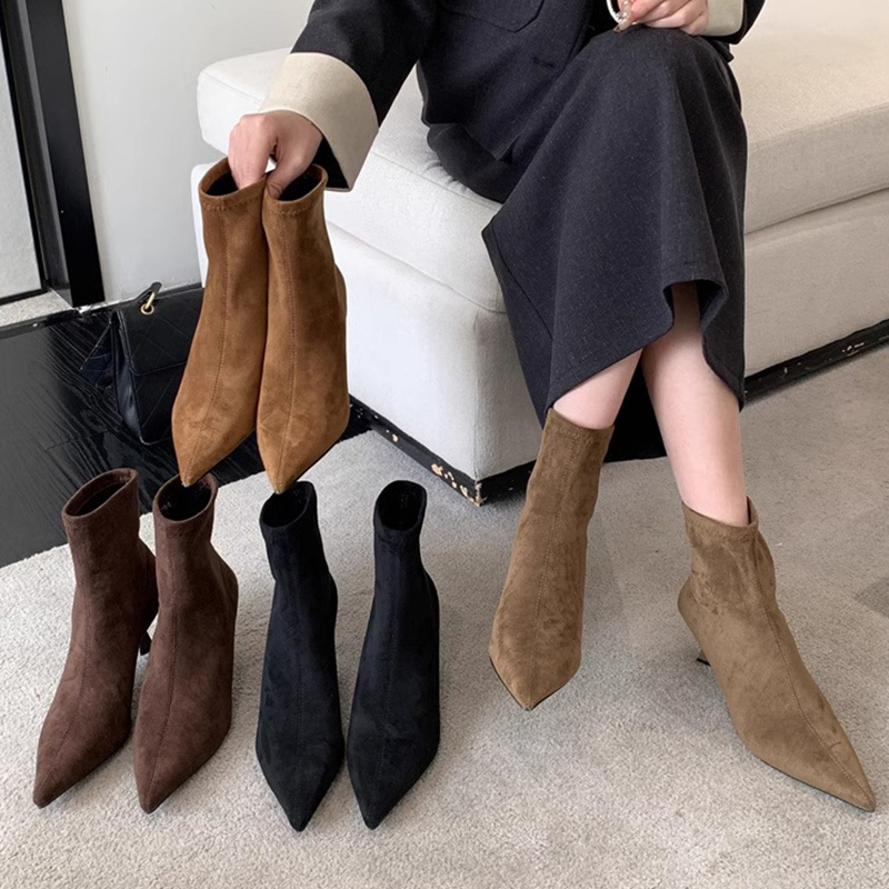 法式尖头高跟短靴女2025秋冬新款百搭绒面瘦瘦靴性感气质细跟裸靴