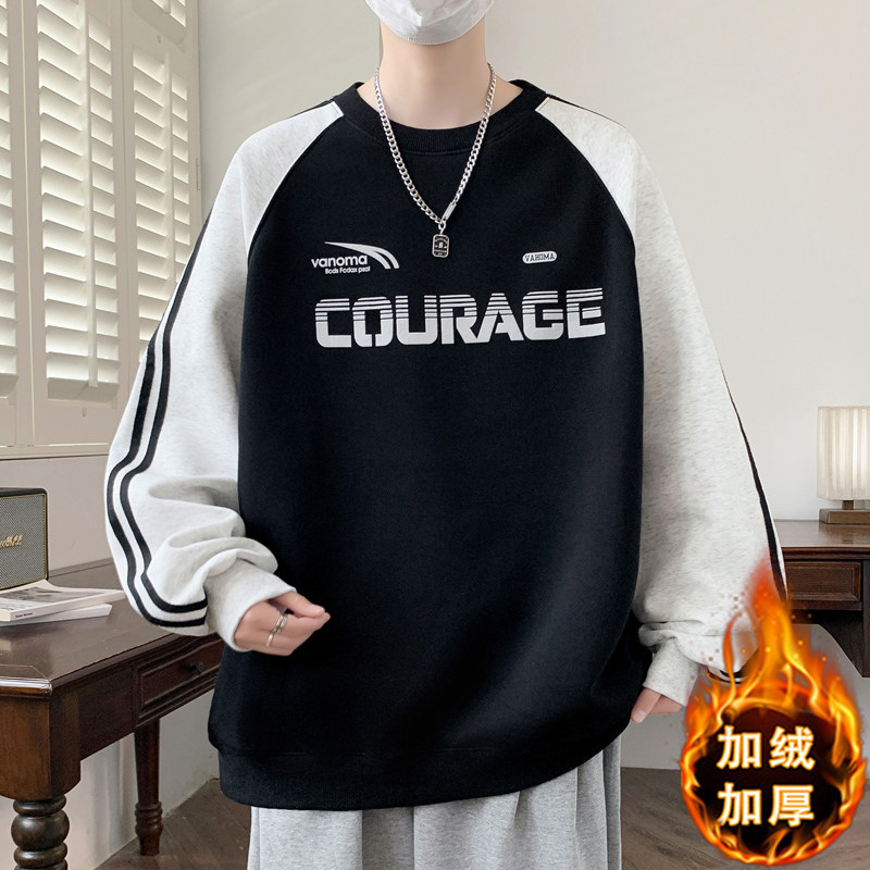 潮牌简约小字母印花圆领加绒卫衣男冬季韩版时尚百搭保暖打底上衣