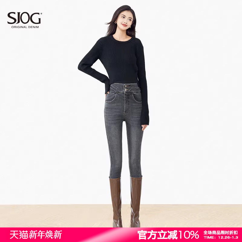 SJOG烟灰色加绒高腰牛仔裤女紧身小脚2025冬显瘦提臀靴裤铅笔裤子