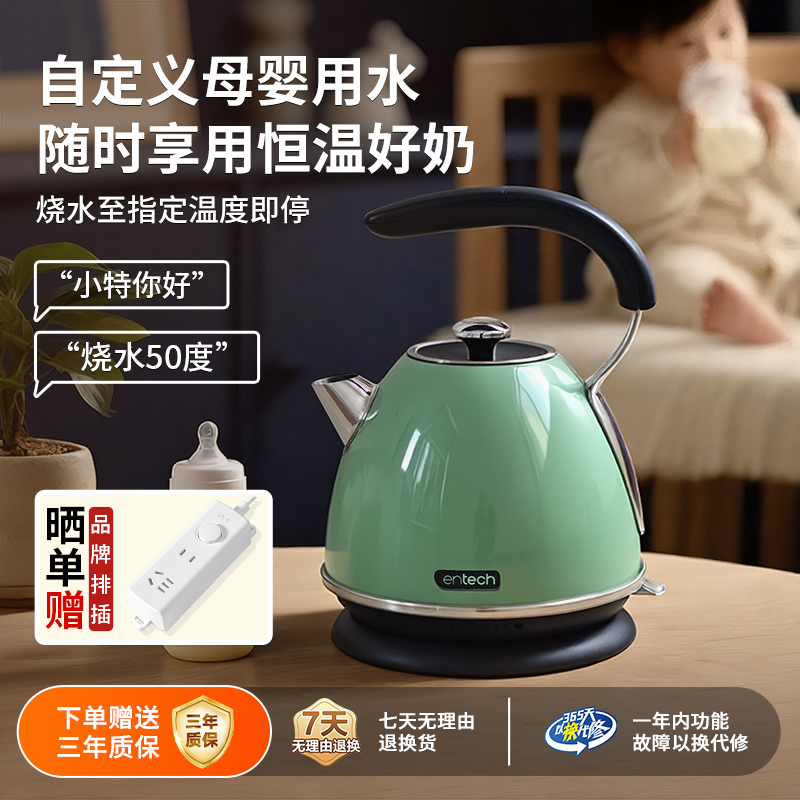 Entech一特高颜值电热水壶 家用烧水壶加厚食品级304不锈钢开水壶