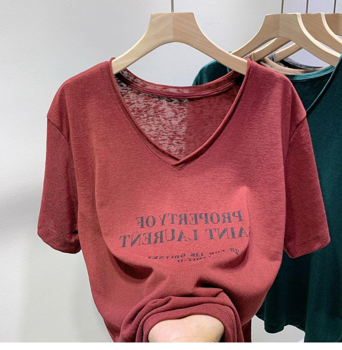 莫代尔纯色v领休闲百搭宽松半短袖t恤女夏季显瘦中长款遮屁股上衣