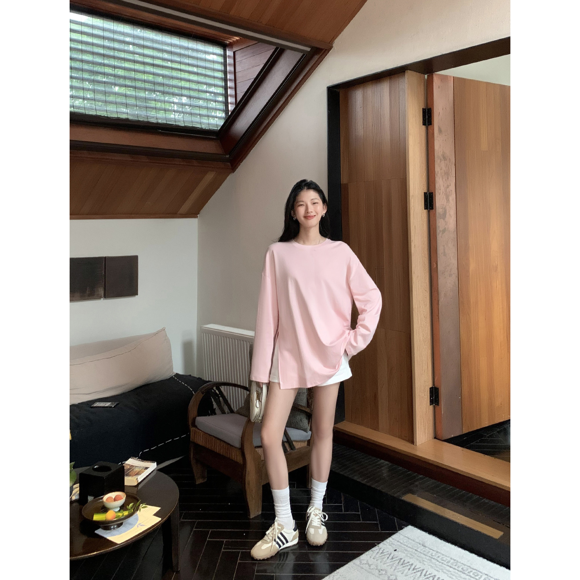 秋冬新款设计长袖T恤女宽松百搭纯棉打底衫内搭中长款开叉上衣ins