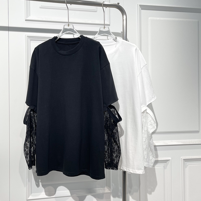 时尚百搭设计感拼接蕾丝袖T恤女冬季新款宽松显瘦减龄中长上衣潮