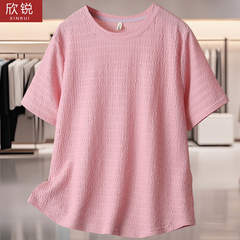 大码胖mm夏装新款肌理感T恤女小衫加肥加大码200斤圆领短袖上衣