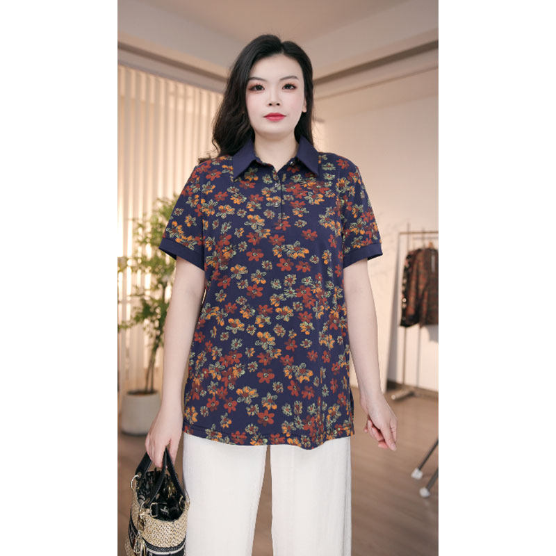 大码女装减龄碎花复古polo衫翻领休闲宽松显瘦加肥加大短袖T恤女