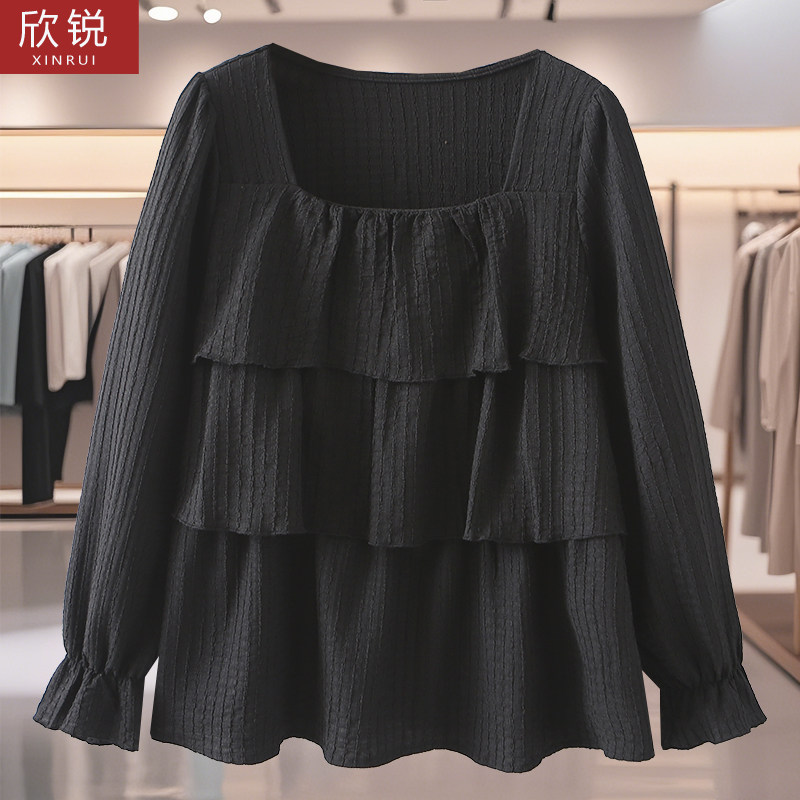 加肥加大码春季新款时尚百搭方领蛋糕多层长袖T恤宽松遮肚子衬衣