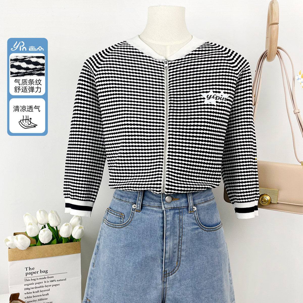 邑品 2024春夏季新款针织衫 粉白条纹百搭洋气减龄舒适 女款毛衣