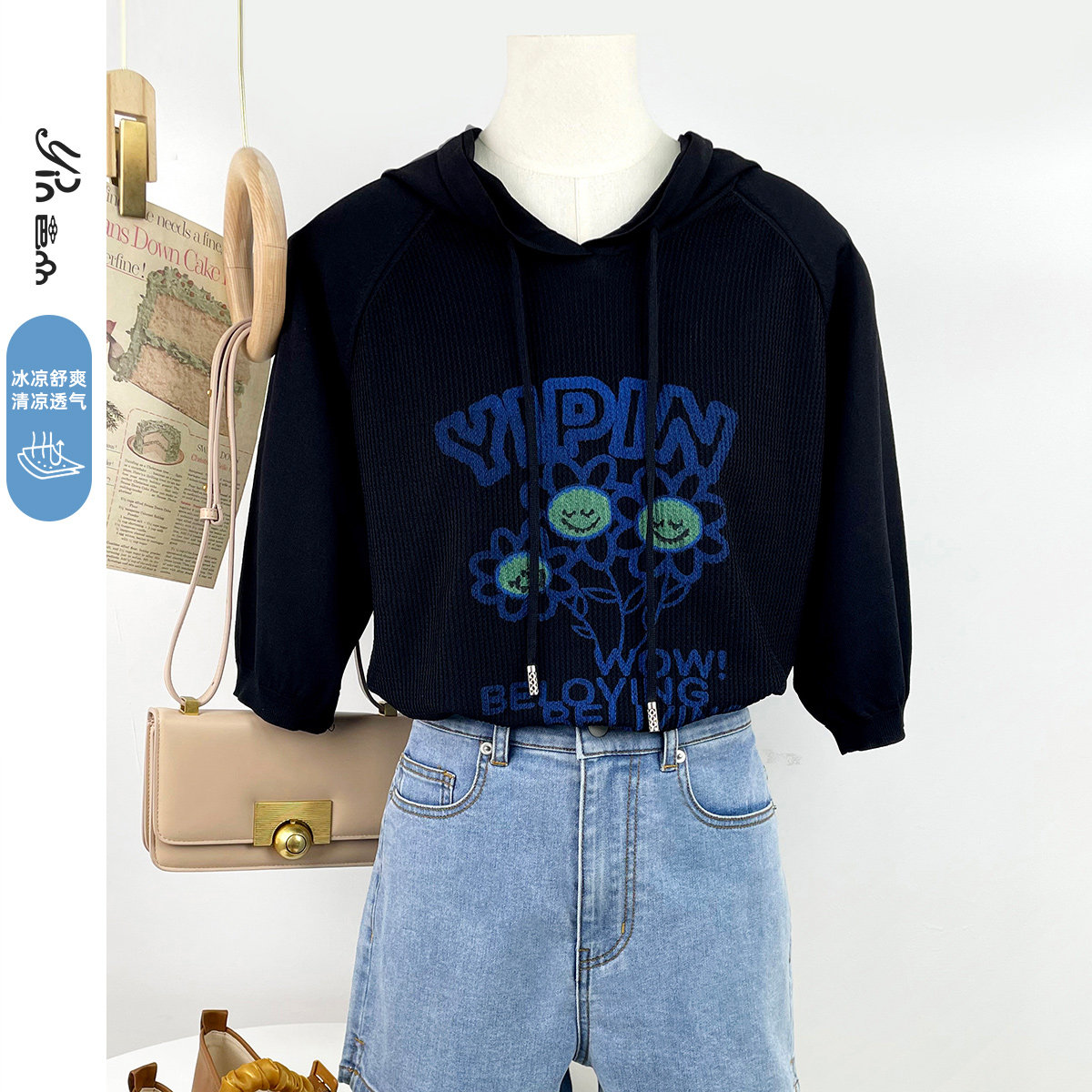 邑品黑蓝色花朵2023新款女式毛衣帽衫春秋季短款连帽印花开衫