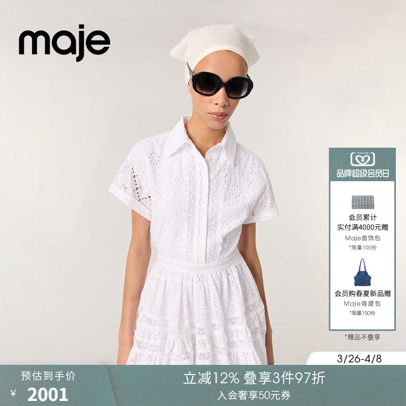 Maje2025春夏女装法式时尚白色镂空花纹刺绣翻领短款收腰连衣裙