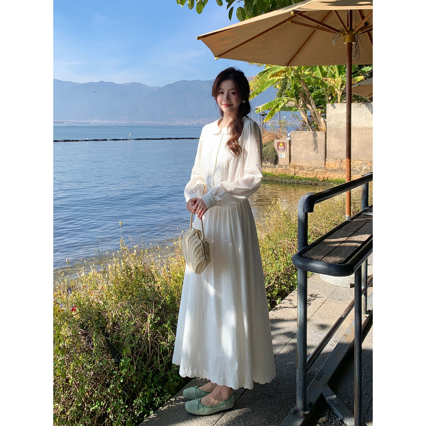 紫涵花边立领米白长袖连衣裙女秋季新款日系淑女暗纹绣花收腰长裙
