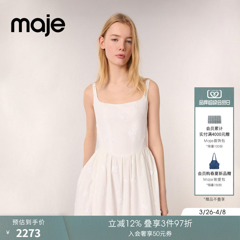 Maje2025春夏女装法式时尚白色印花刺绣无袖收腰长款吊带连衣裙