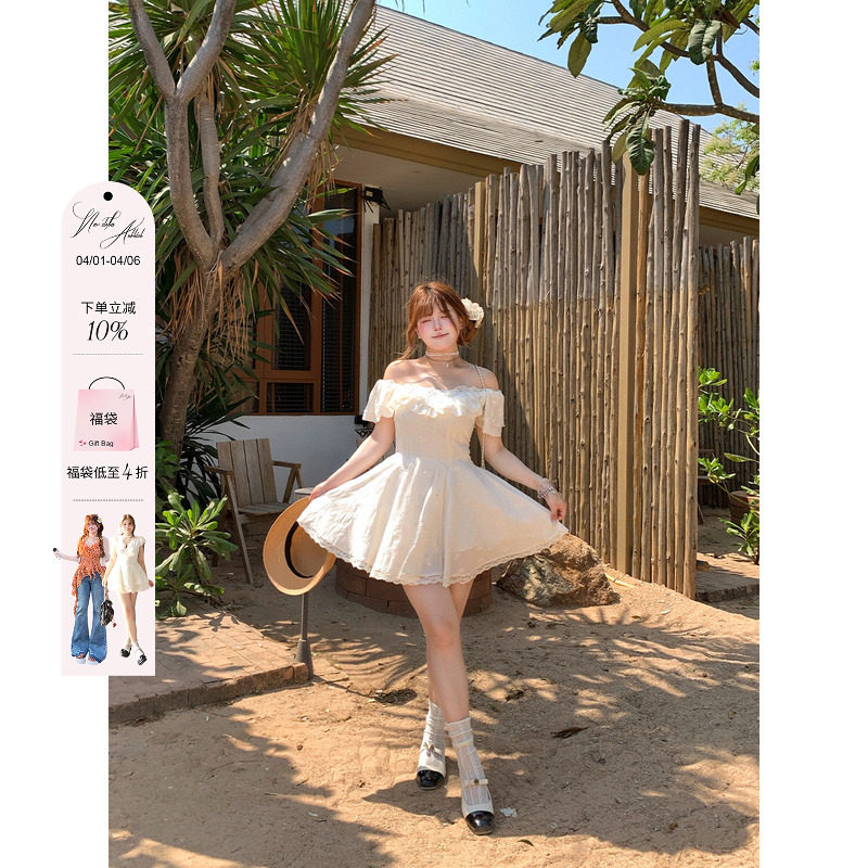 ANNATTO 茉莉苔痕 少女感米白色绣花V领蕾丝花边a字收腰连衣裙女