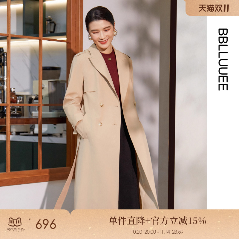 BBLLUUEE/粉蓝衣橱经典通勤风衣中长款女2025秋装西装领杏色外套