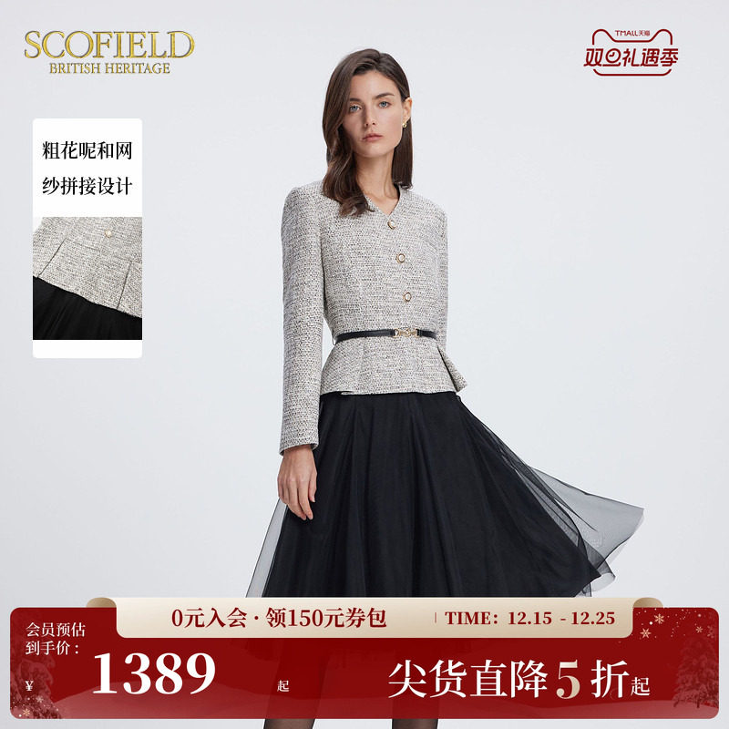 Scofield女装奢雅V领粗花呢网纱拼接收腰A摆连衣裙2025春季新品
