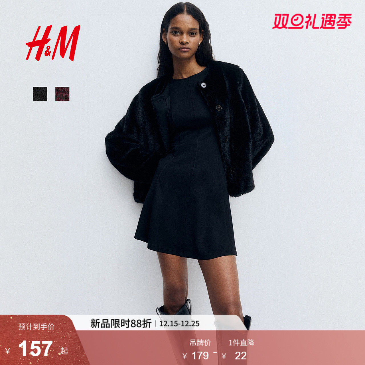 HM女装连衣裙2026春季新款红色新年罗马布喇叭裙摆短款裙1321300