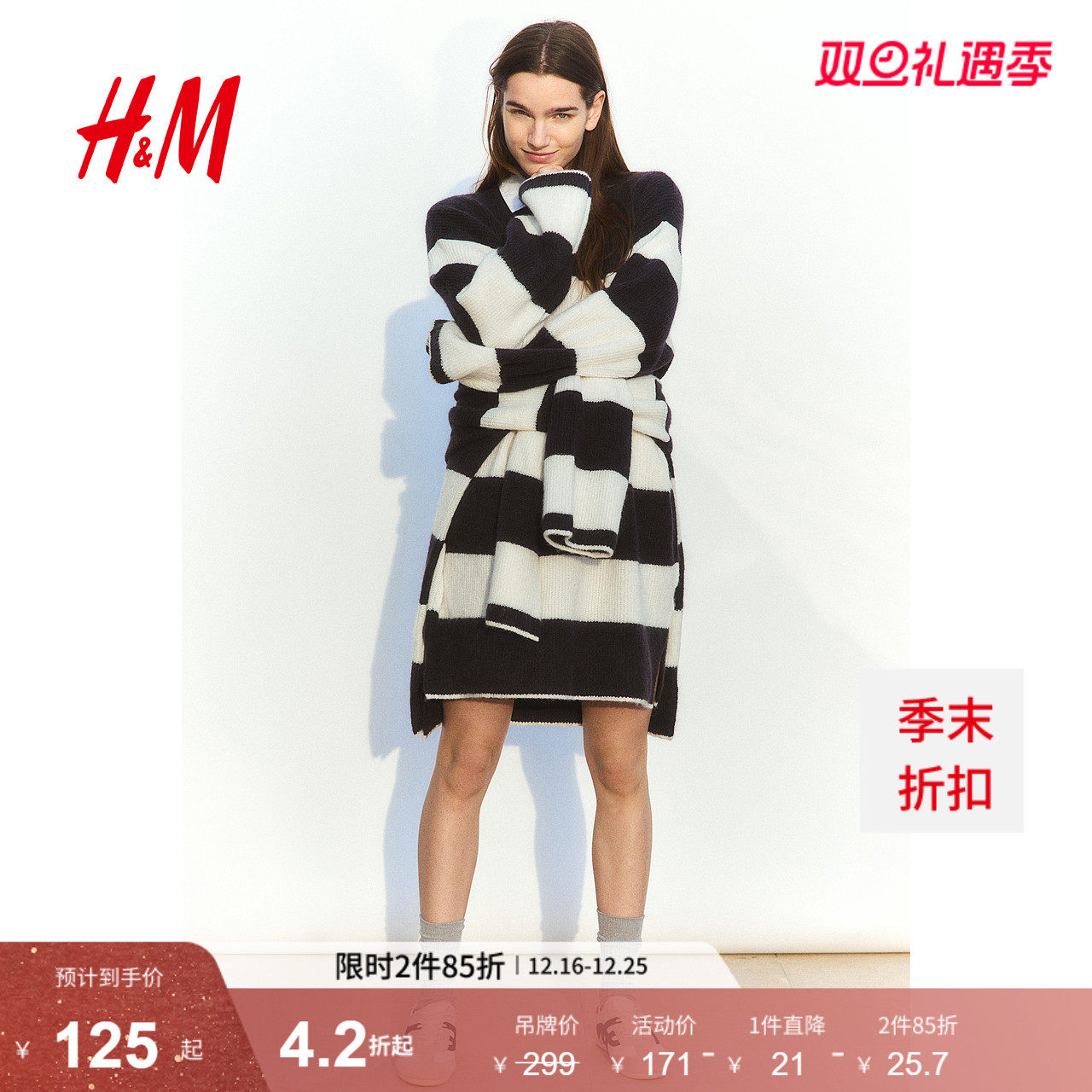 HM女装连衣裙2026年春季新款法式针织条纹圆领长袖中长裙1270558