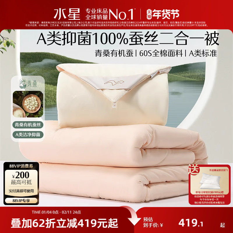 水星家纺被子100%蚕丝被四季通用二合一保暖冬季被芯青桑有机蚕丝
