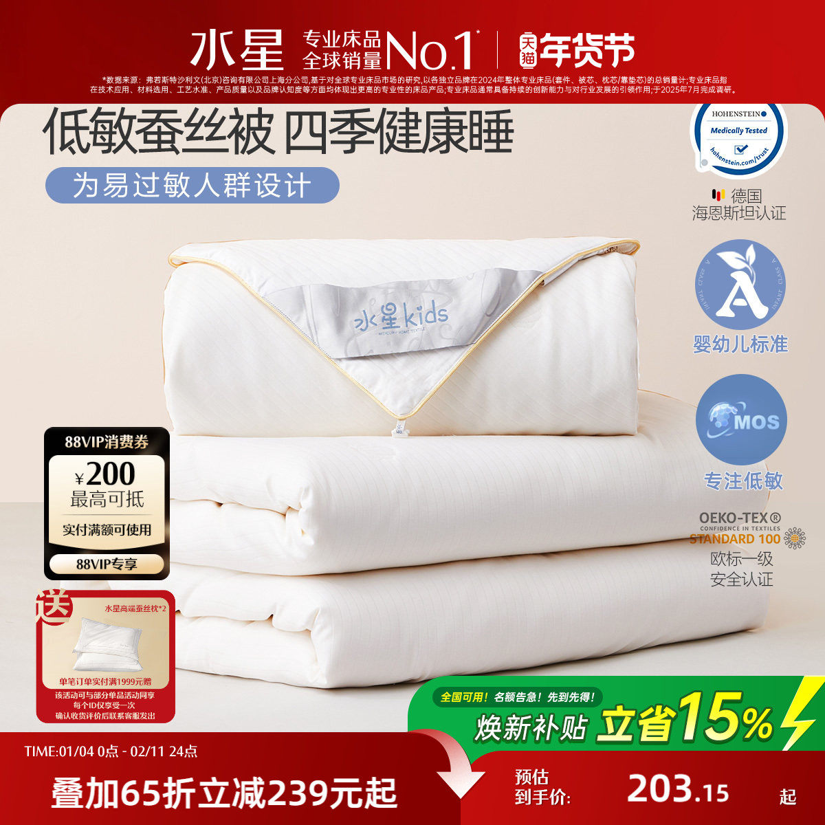 水星家纺100%蚕丝被芯抗菌冬季被子蚕丝子母被二合一被新年送礼