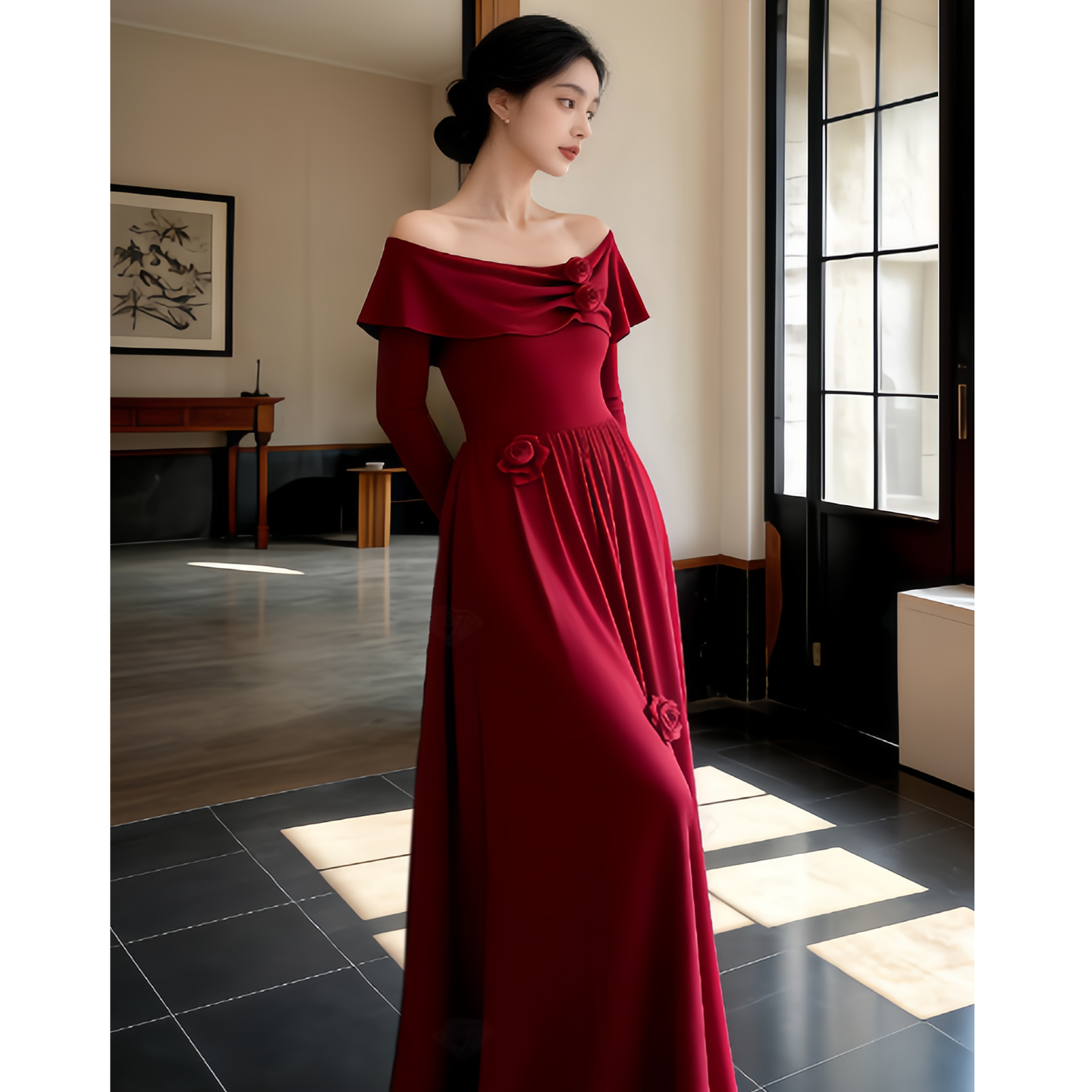巷里法式一字肩红色连衣裙秋冬赫本显瘦气质订婚敬酒开叉礼服长裙