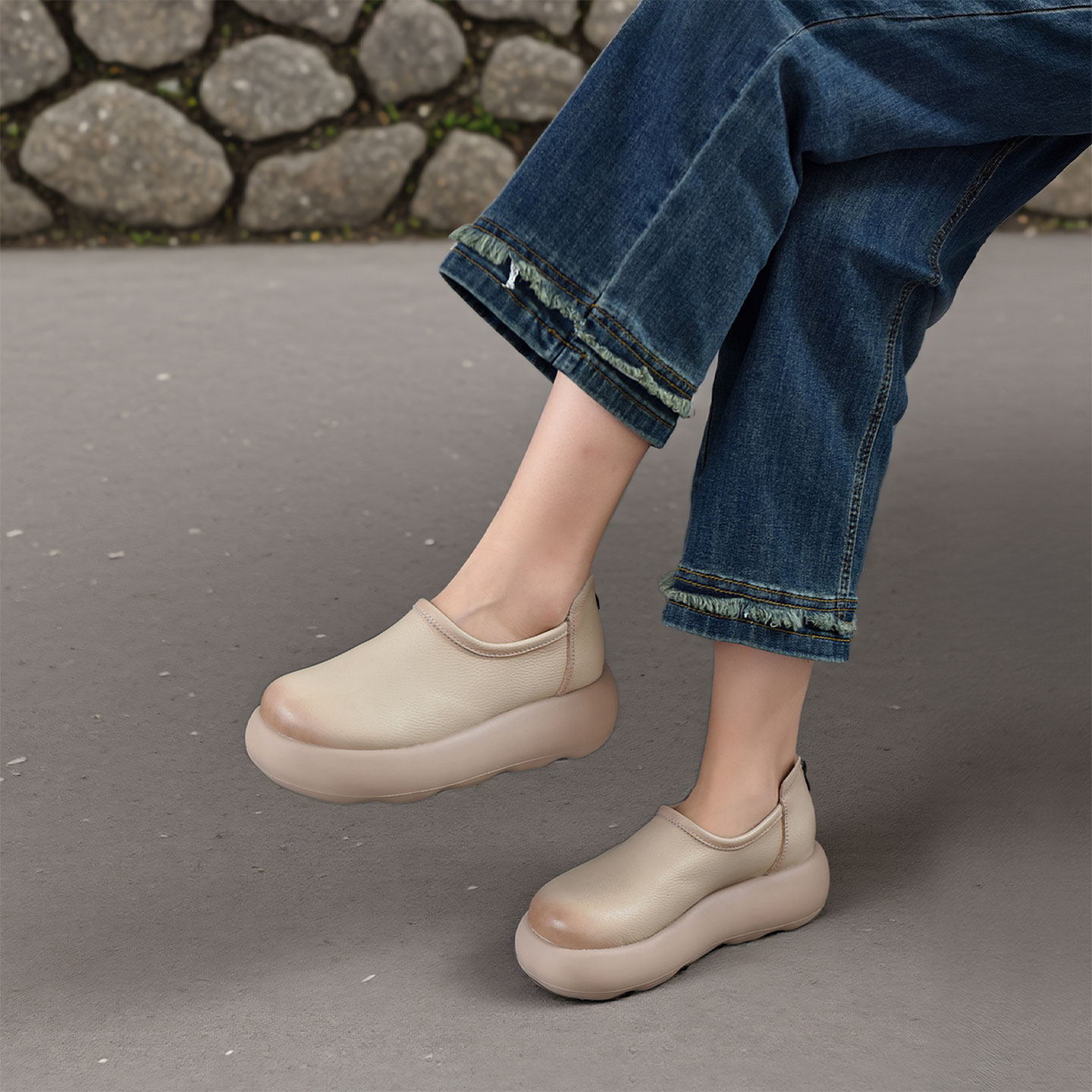 四起哥2026春简约风真皮厚底乐福鞋女圆头松糕鞋轻便百搭休闲单鞋