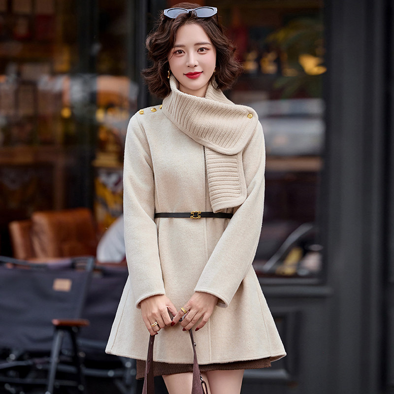 高级感!25冬季新款针织围巾圆领双面羊绒大衣女宽松厚款毛呢外套