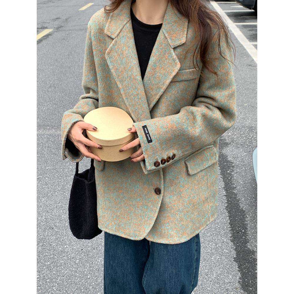2025秋冬韩版双面羊绒大衣女宽松短款格子小西装羊毛呢外套小个子