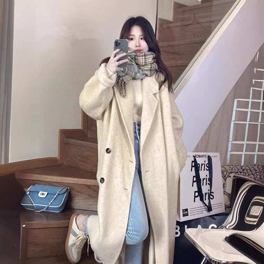米白色双面羊绒大衣女中长款双排扣西装领宽松大码小个子毛呢外套