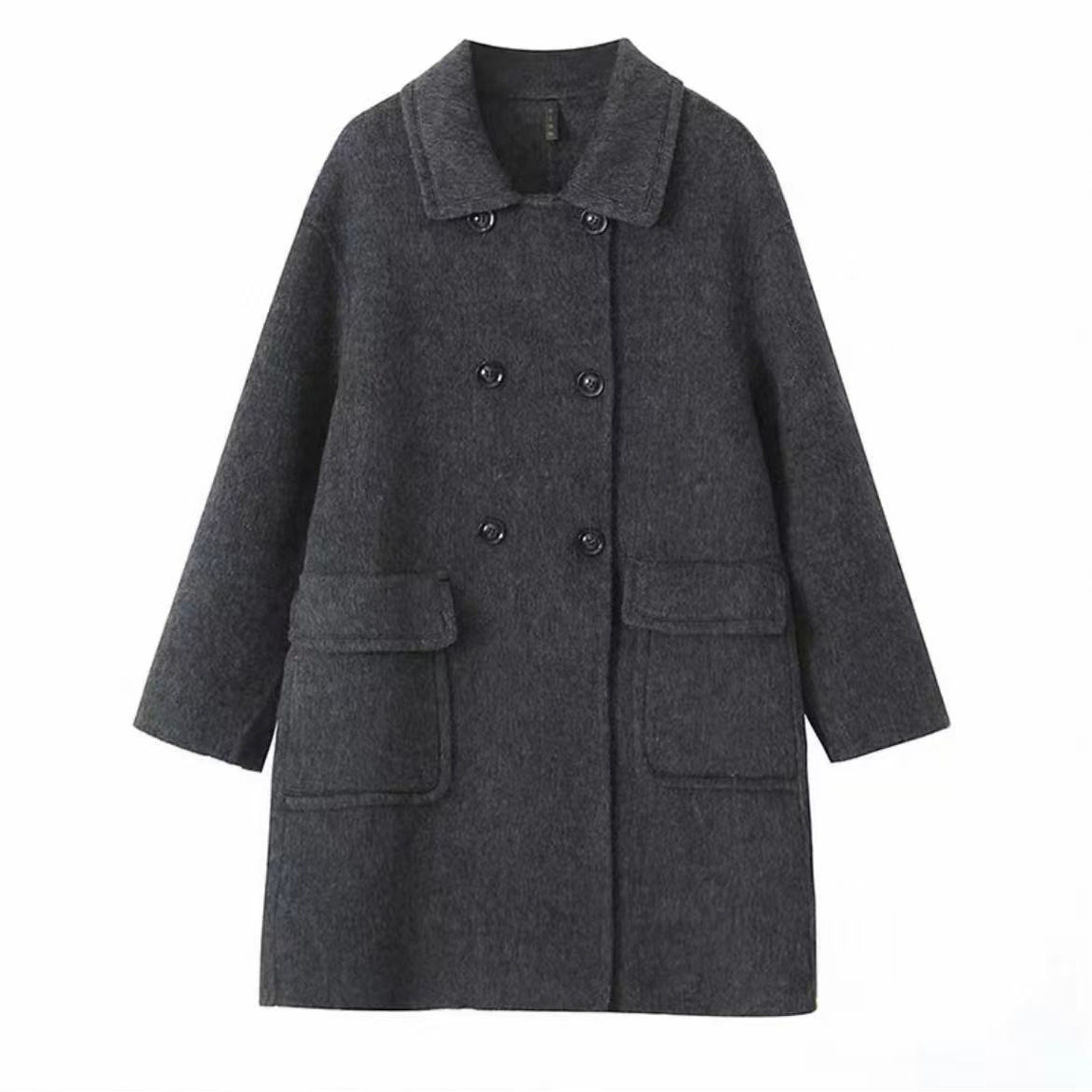 - 双排扣呢子大衣女长款