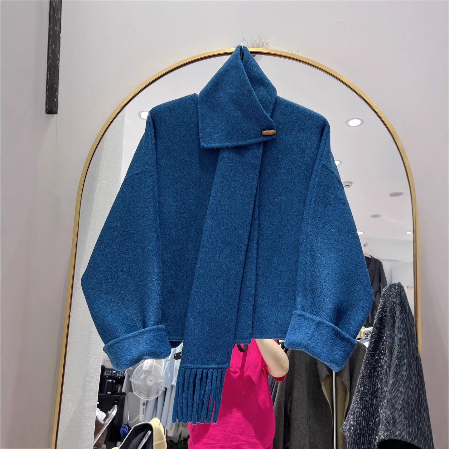 2025秋冬新款流苏围巾V领可脱卸双面羊绒大衣女宽松短款毛呢外套