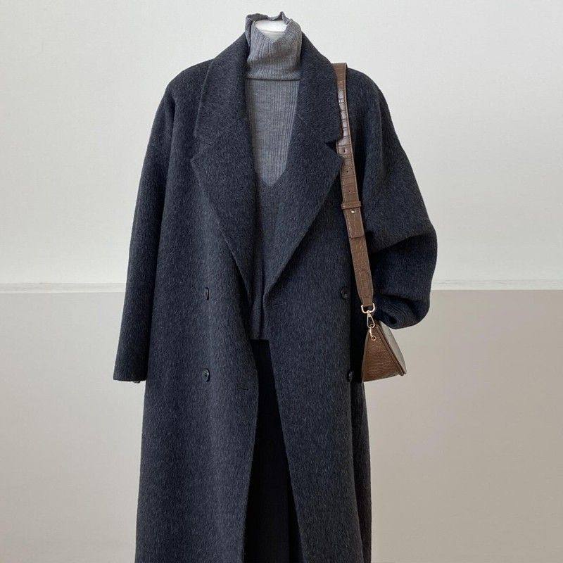 2025年冬季新款灰色中长款双面羊绒大衣女宽松韩版廓形羊毛呢外套