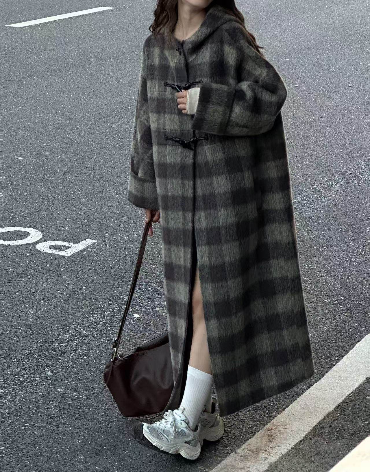 韩版秋冬新格纹牛角扣连帽双面羊绒大衣女宽松显瘦长款羊毛呢外套