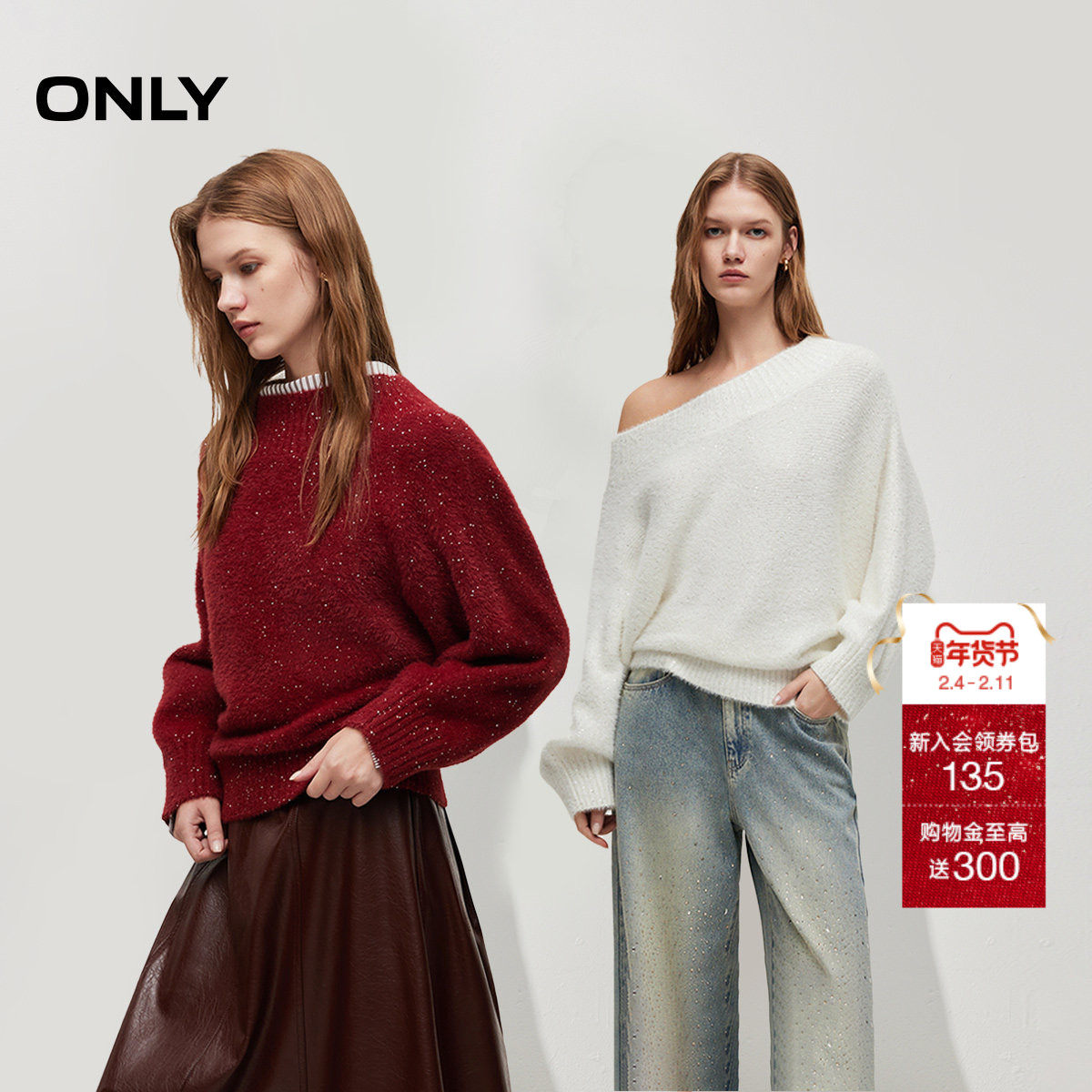 ONLY2026春季新款亮片纱线蝙蝠袖宽松亲肤软糯长袖红色针织衫毛衣