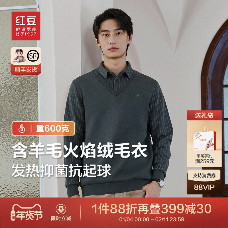 红豆加绒假两件毛衫中老年爸爸保暖打底衫内搭衬衫领针织衫毛衣男