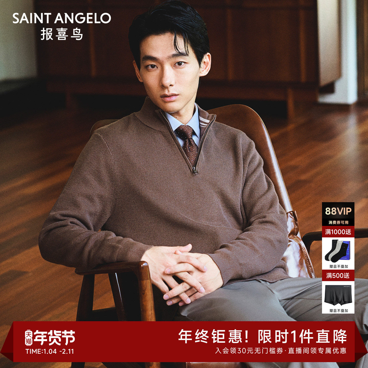 【半高领拉链】报喜鸟秋季新款男士商务羊毛针织衫毛衣内搭毛衫男