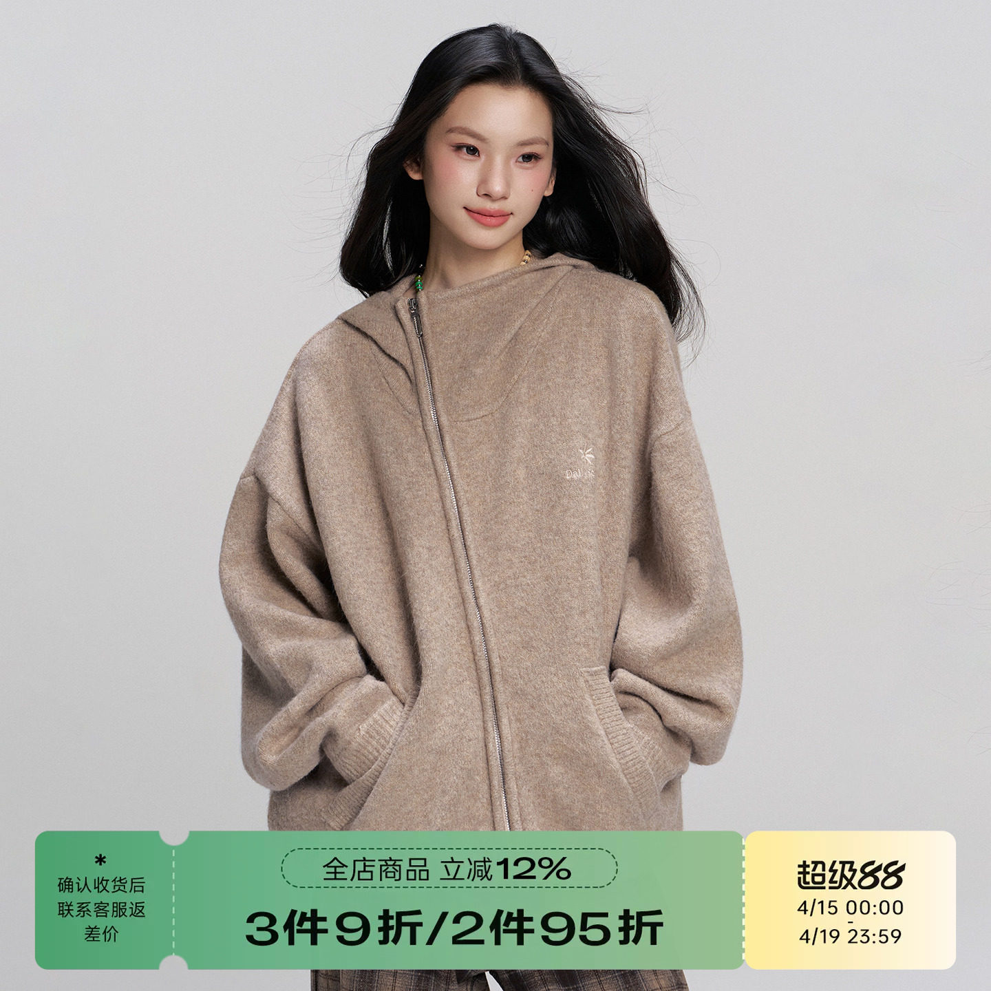 连帽双拉链软糯长袖针织开衫毛衣外套女春季时尚气质帽衫休闲上衣