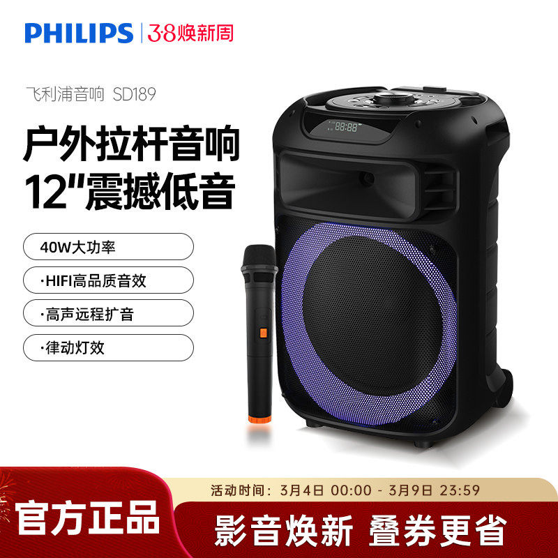 飞利浦12英寸户外蓝牙拉杆音箱大功率重低音户外广场舞音响SD189
