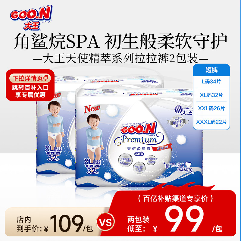 【百补】大王升级天使精萃短裤纸尿裤L/XL/XXL/XXXL码 2包装透气