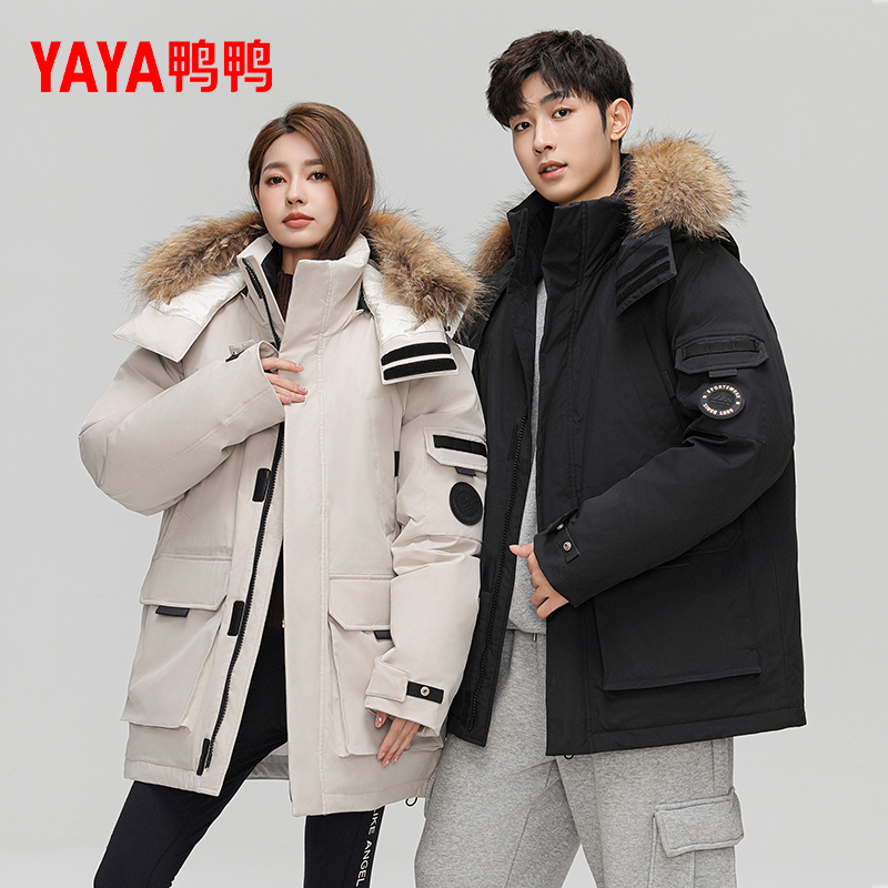 鸭鸭男女中长款羽绒服女2025冬季新款时尚连帽毛领加厚情侣外套潮
