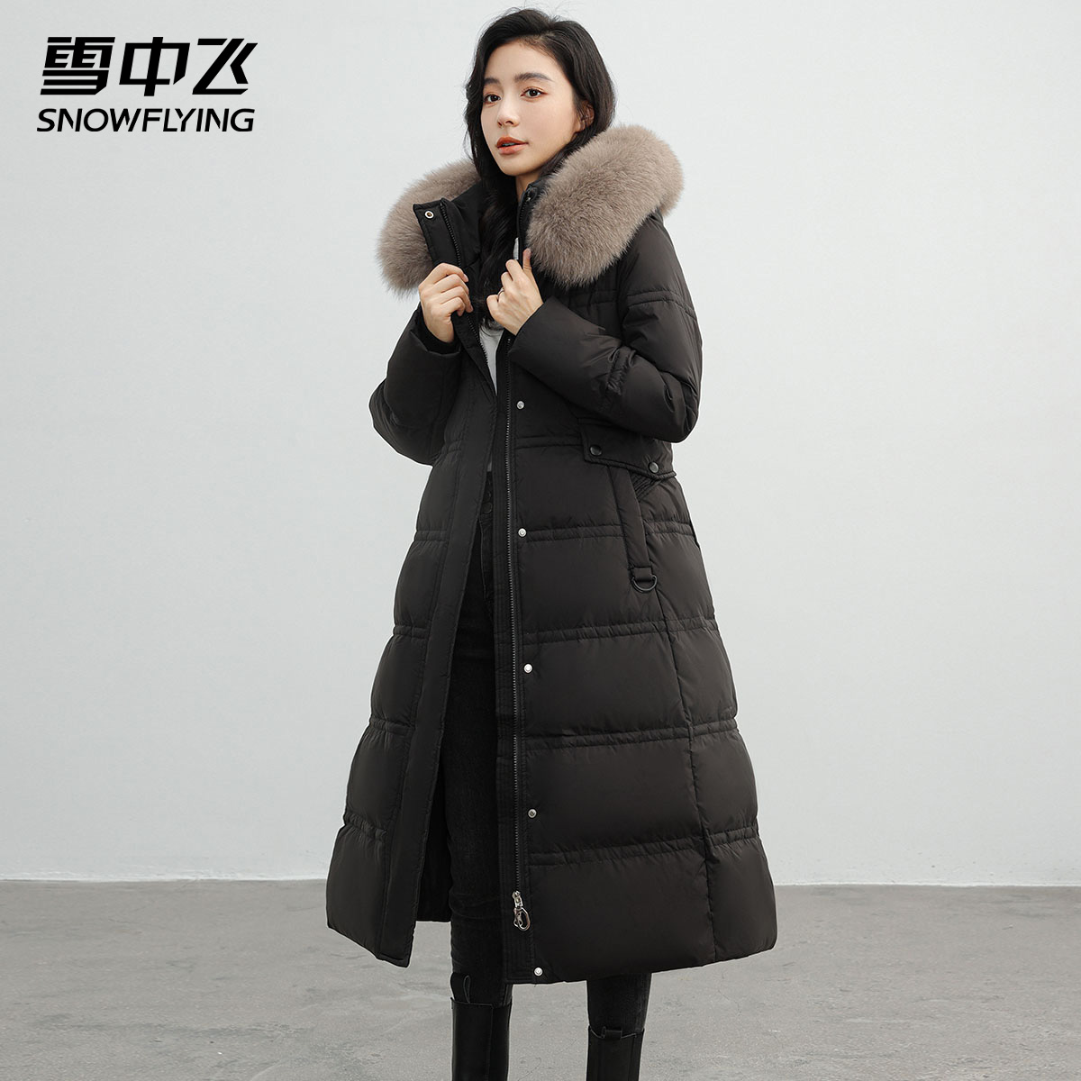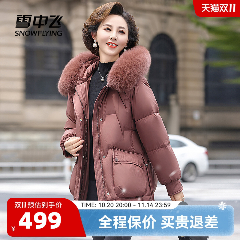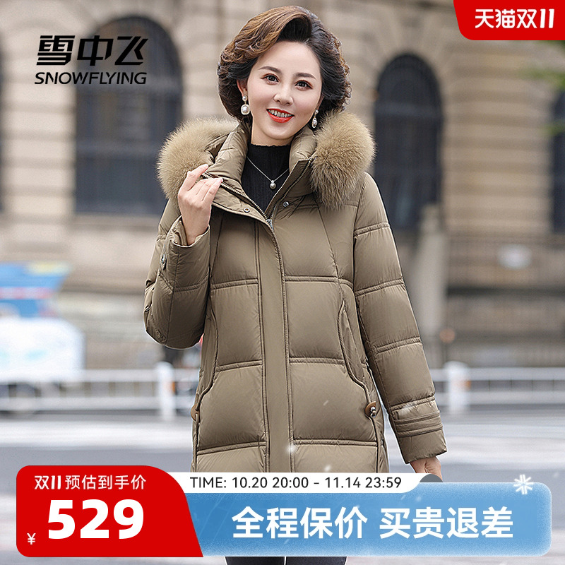 雪中飞2025冬新款女士妈妈款中长羽绒服连帽狐狸毛领保暖洋气潮