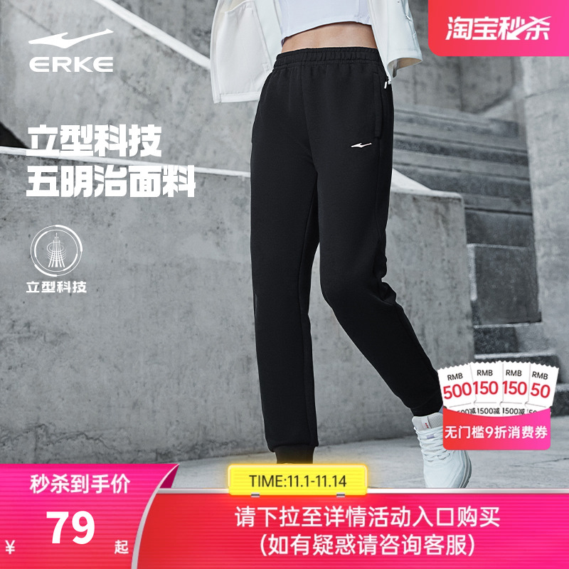 特步加绒卫裤女冬季女装束脚裤针织裤休闲运动裤卫裤百搭黑色裤子