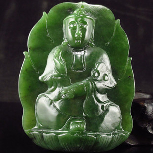 玉器收藏超润无裂和田碧玉高级菠菜绿山料精雕观音菩萨大牌子挂件