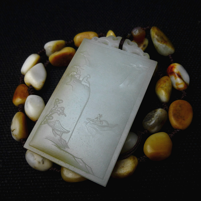 高端保真和田玉黄沁皮籽料随形项链原石原籽配苏工薄意山水玉牌子