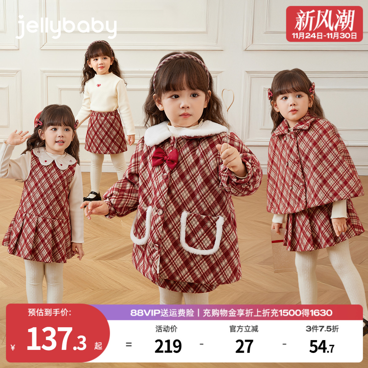 senbaby童装冬装儿童过年毛呢外套女童加棉呢子大衣格子大衣