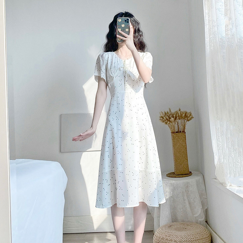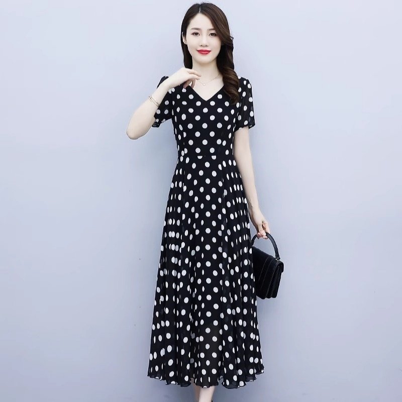 波点雪纺连衣裙女中长裙夏季新款短袖收腰显瘦气质小清新a字裙子