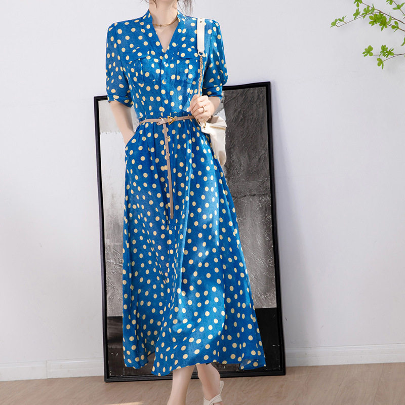 波点雪纺连衣裙女夏季2025新款收腰显瘦长裙气质v领a字复古裙子女